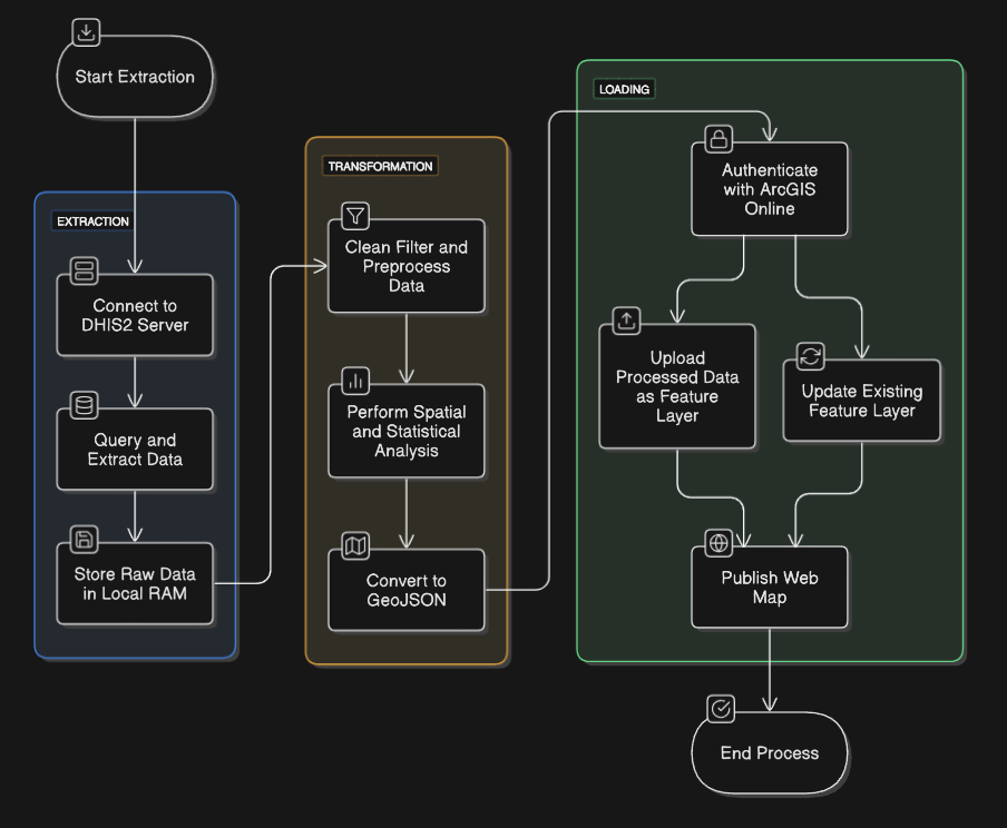ETL Pipelines for Geostatical Small Area Estimation Modelling FHI 360’s work primarily focused on highly rural and economically disadvantaged regions, which often resulted in limited data coverage. My role involved compiling continuous datasets across the study area to correlate with available indicators. These indicators were then used to estimate values for areas with low or no data coverage. Within this framework, I leveraged various environmental and social data sources through APIs and processed the data using Python. The processed data was then stored in PostgreSQL databases, supporting multiple projects.